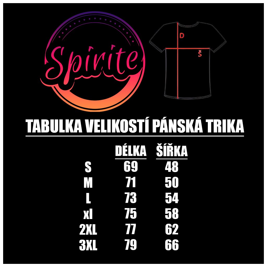 Pánské tričko s potiskem, 100% bavlna, 165 g/m2. Každé tričko tiskneme sólo, každé tričko je tak jedinečné. Před objednáním si, prosím, prohlédněte tabulku velikostí, kterou najdete mezi obrázky triček.